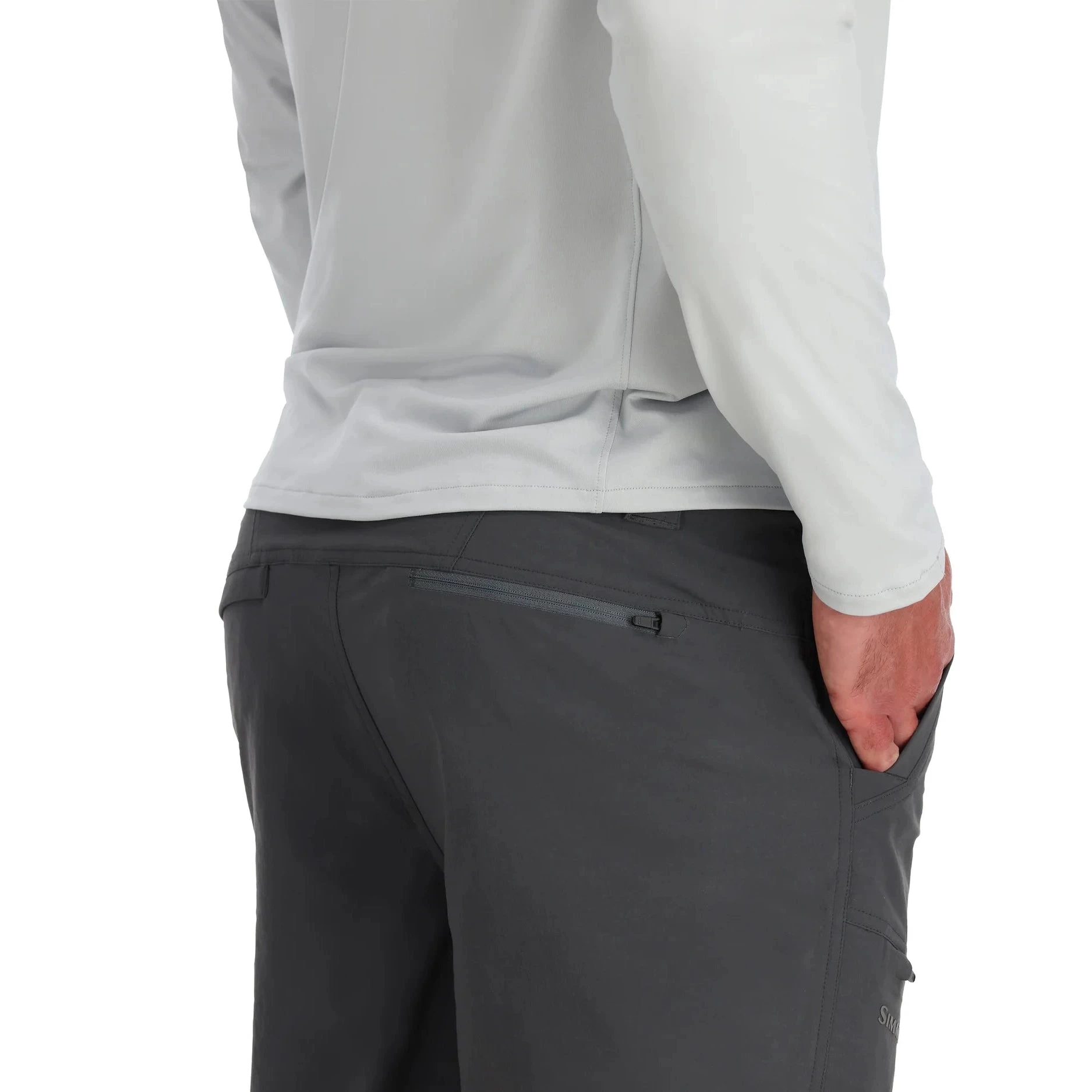 - Two front drop-in hand pockets and two back pockets. Back right pocket zips closed to secure essentials. All pocket bags are mesh-lined for fast water drainage.